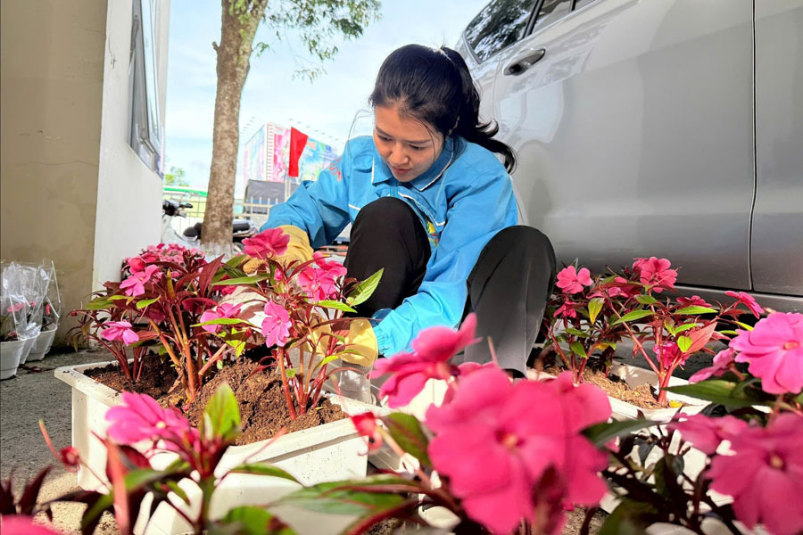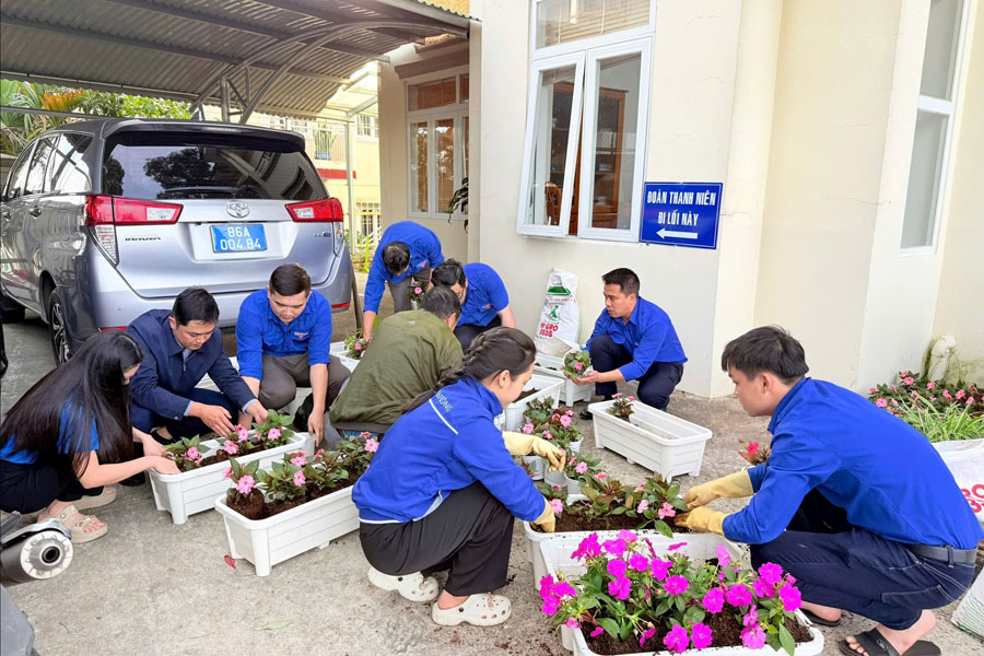 Đoàn viên, thanh niên chăm sóc bồn hoa trong khuôn viên cơ quan